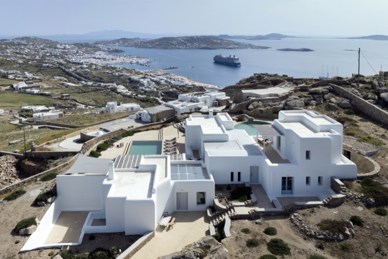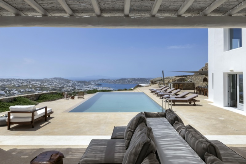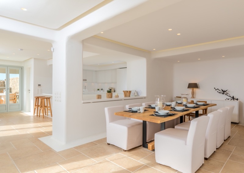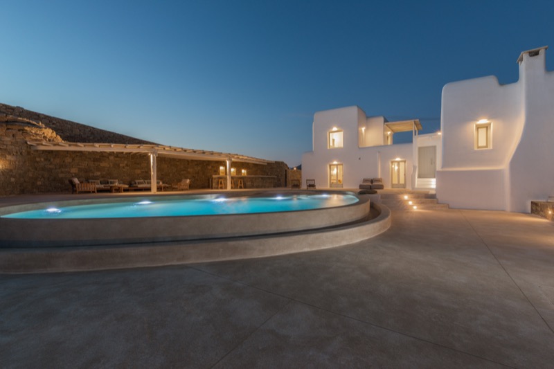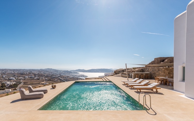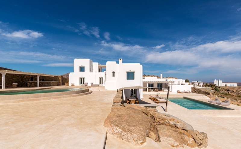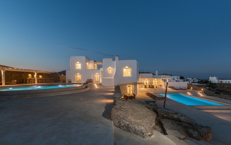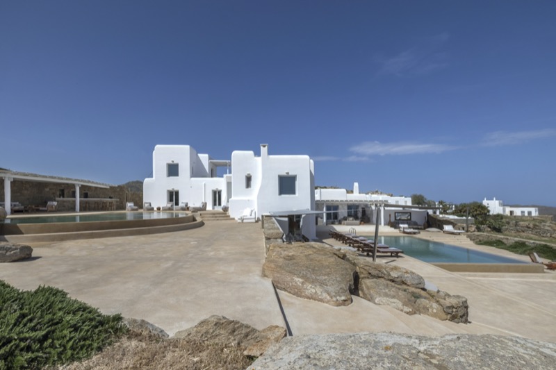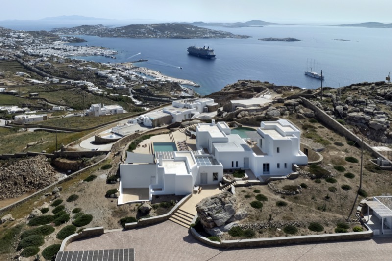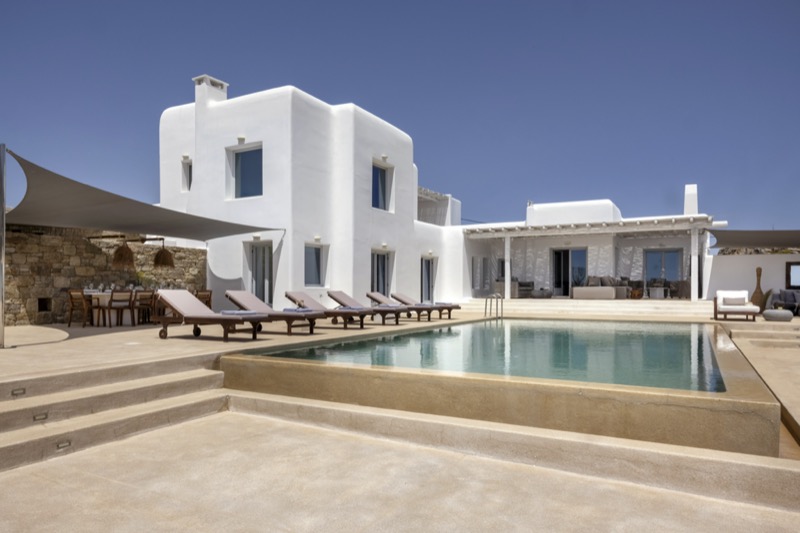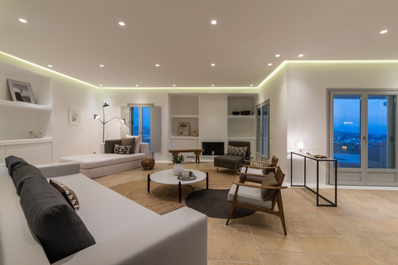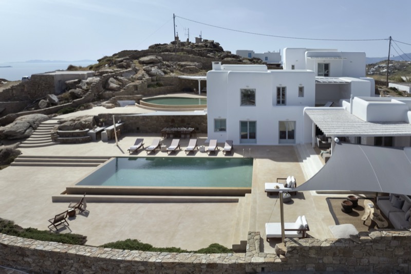 This 7-bedroom villa in Mykonos blends traditional Cycladic architecture with modern comforts, creating a relaxed and elegant setting for a group or family stay. Perched on a hillside, the villa offers panoramic views of the Aegean Sea, especially striking at sunset.