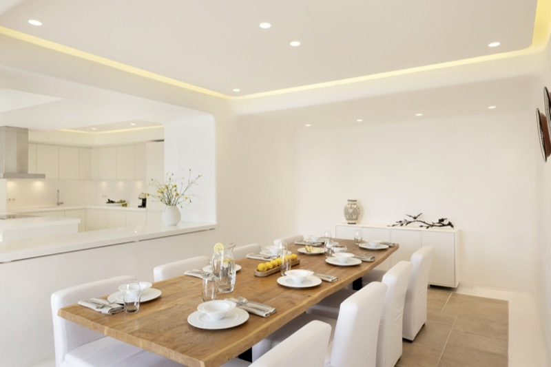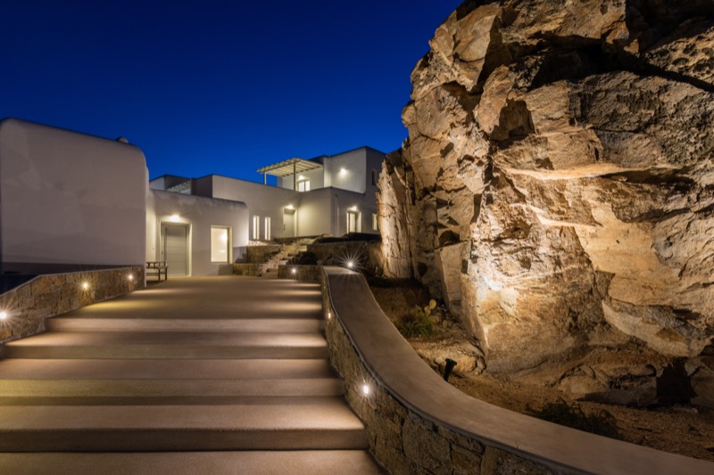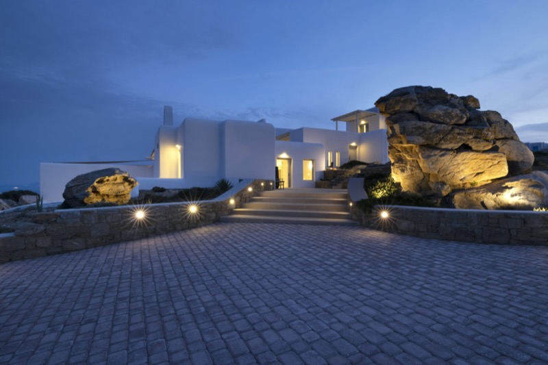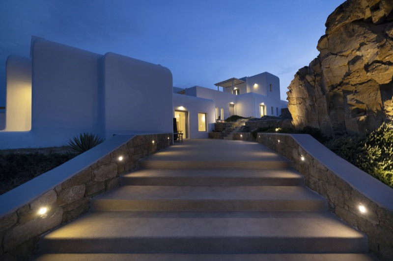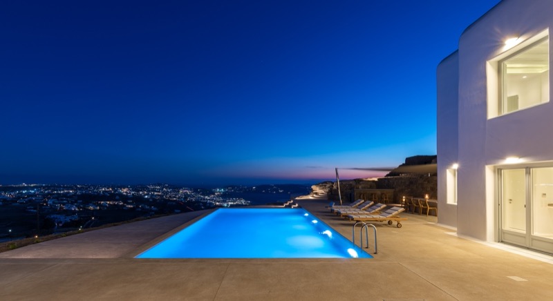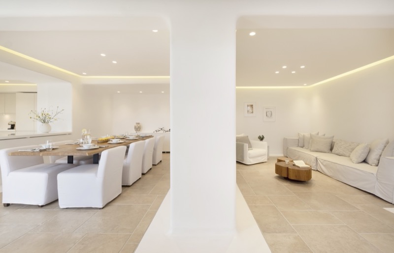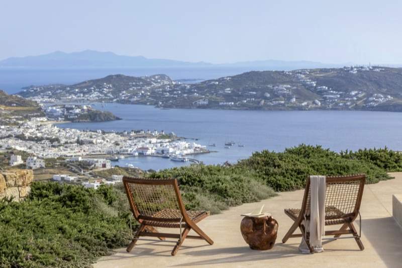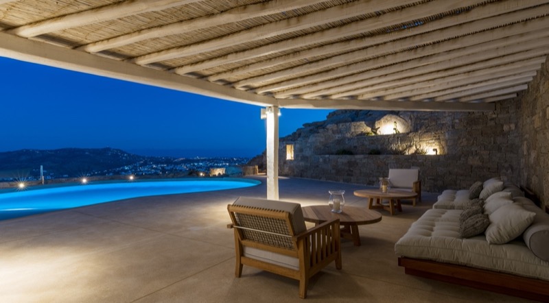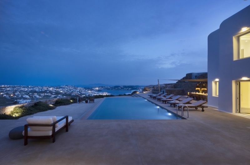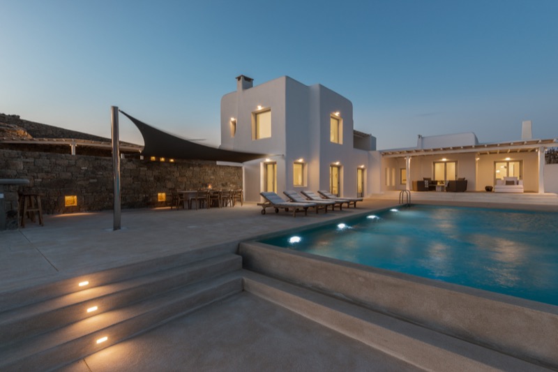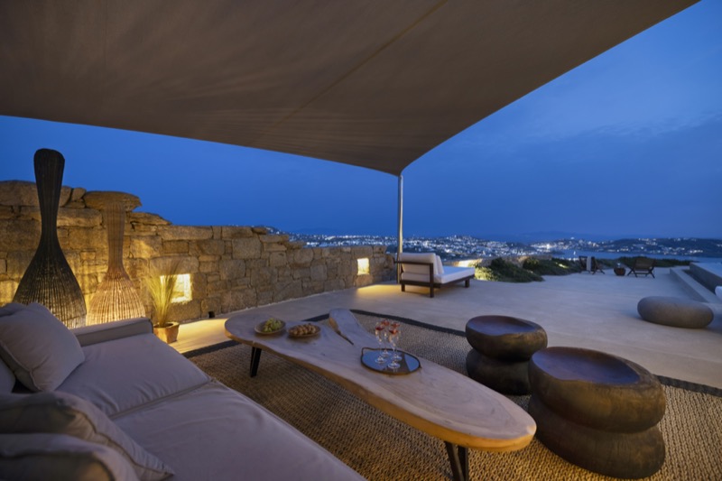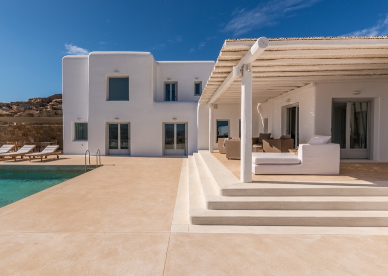 This 7-bedroom villa in Mykonos blends traditional Cycladic architecture with modern comforts, creating a relaxed and elegant setting for a group or family stay. Perched on a hillside, the villa offers panoramic views of the Aegean Sea, especially striking at sunset.