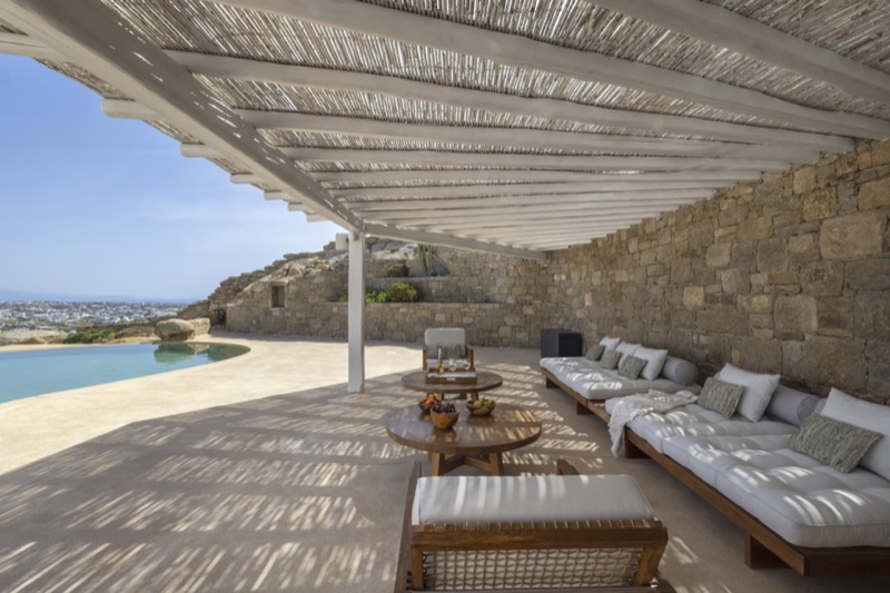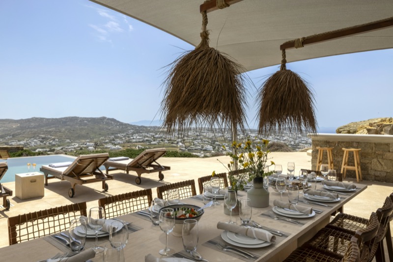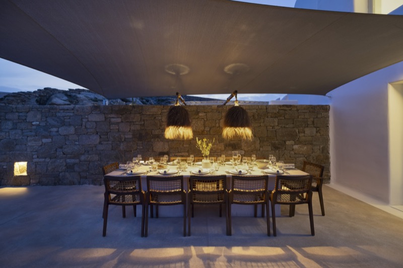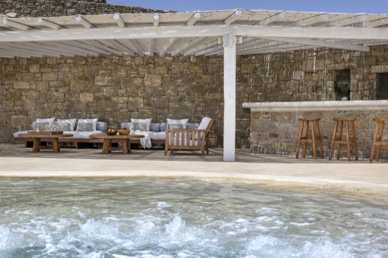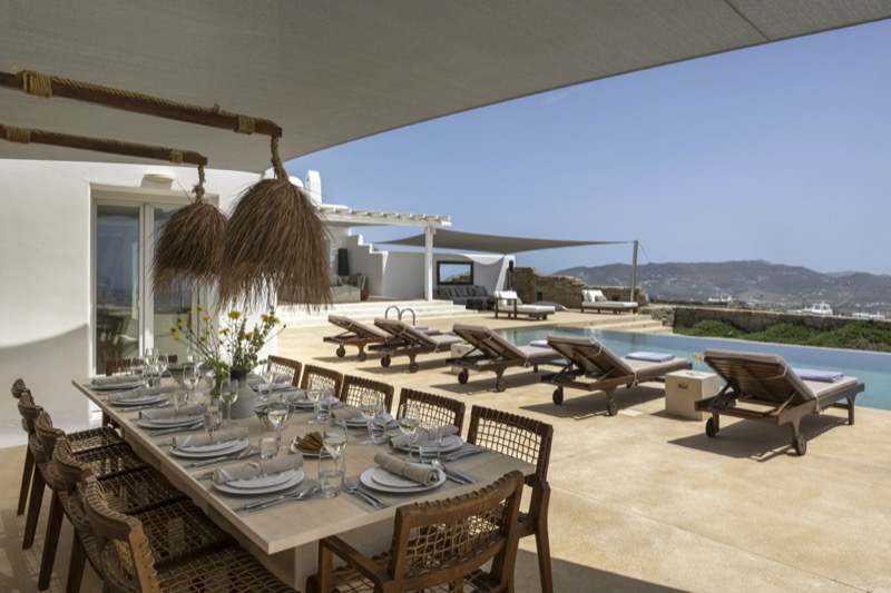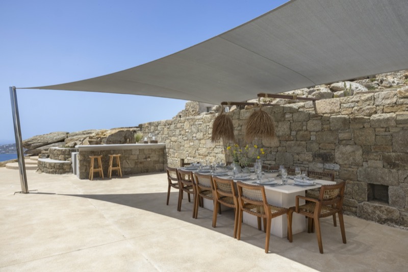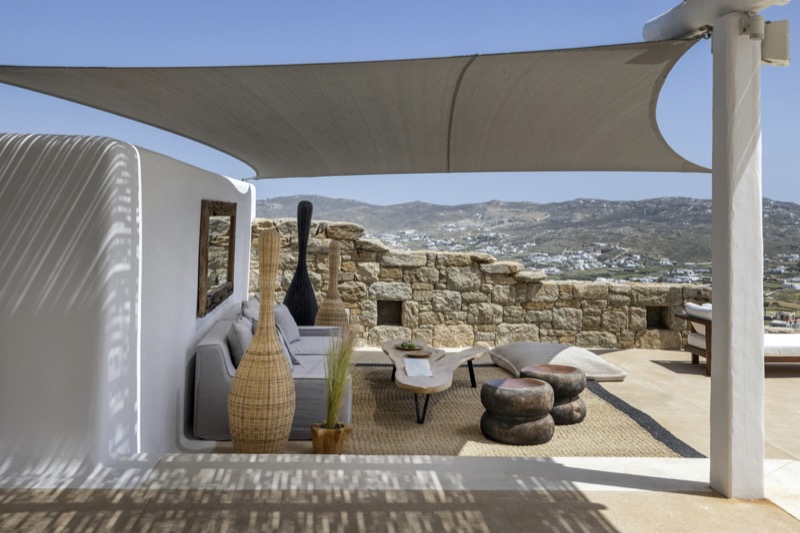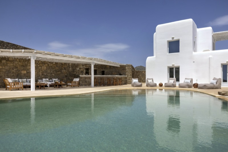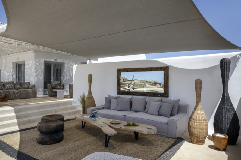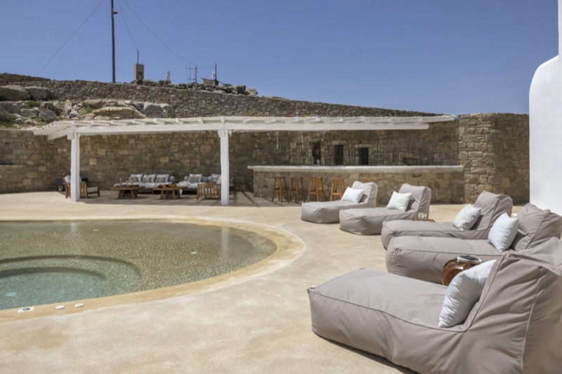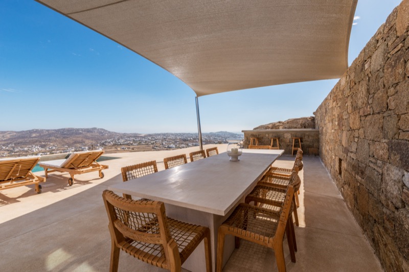 Outside, the villa features a private pool surrounded by shaded lounges, dining spaces, and terraces that invite slow mornings and long evenings under the stars. Though peaceful and private, the villa is just a short drive from beaches, local tavernas, and the vibrant energy of Mykonos Town.