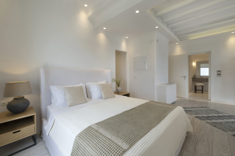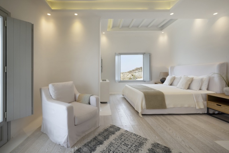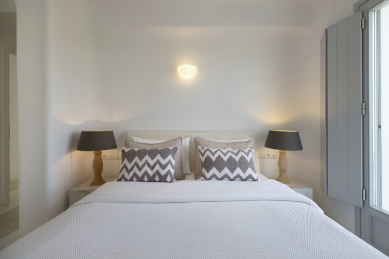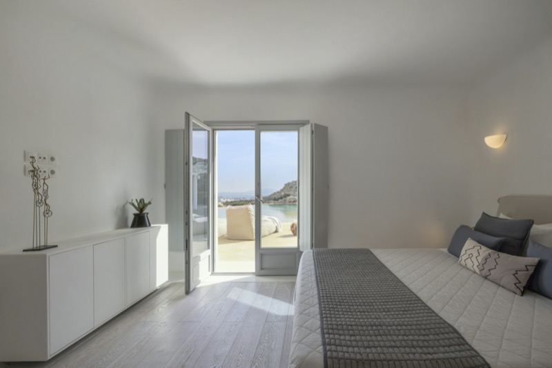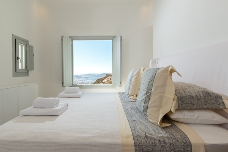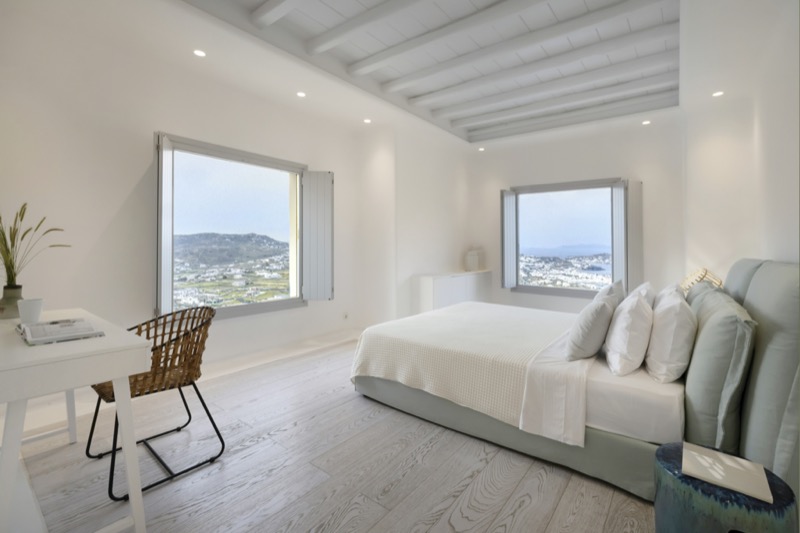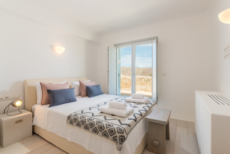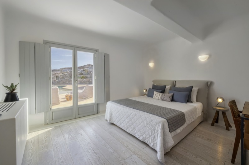 One master bedroom with king size bed, A/C, en-suite bathroom with shower, safe box, hairdryer, walk-in closet, Wi-Fi, amazing view of Mykonos town, access to private terrace