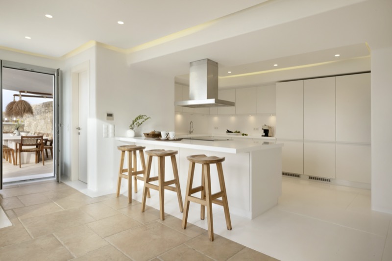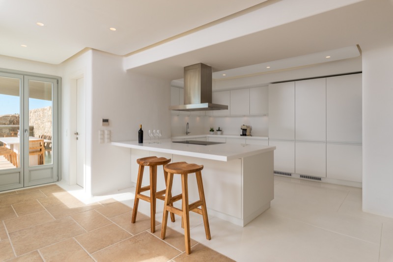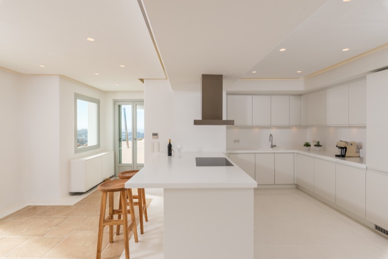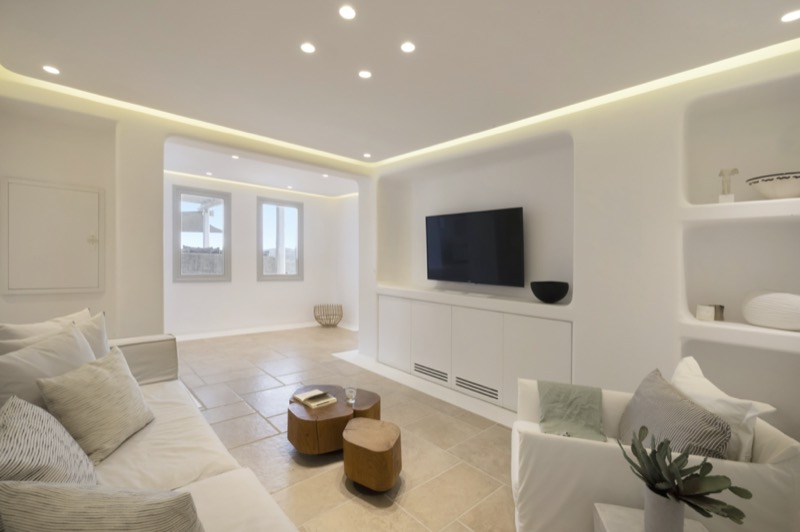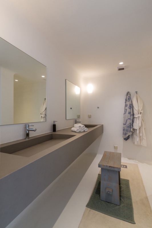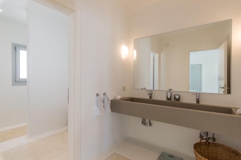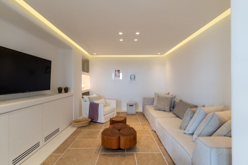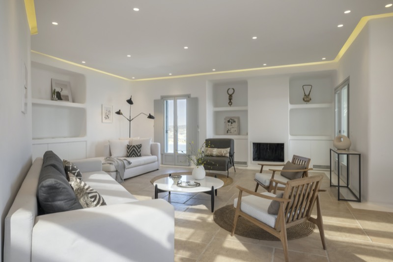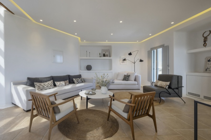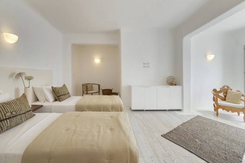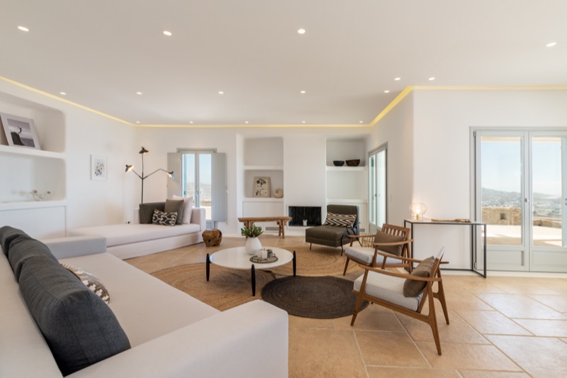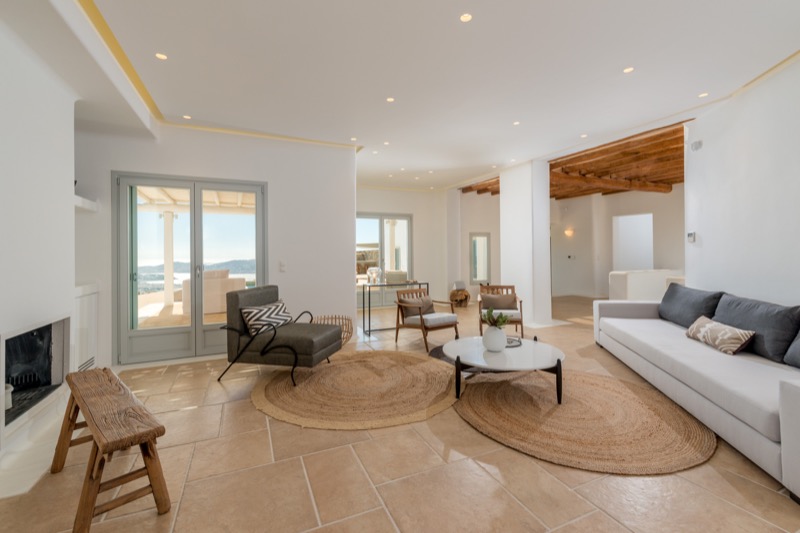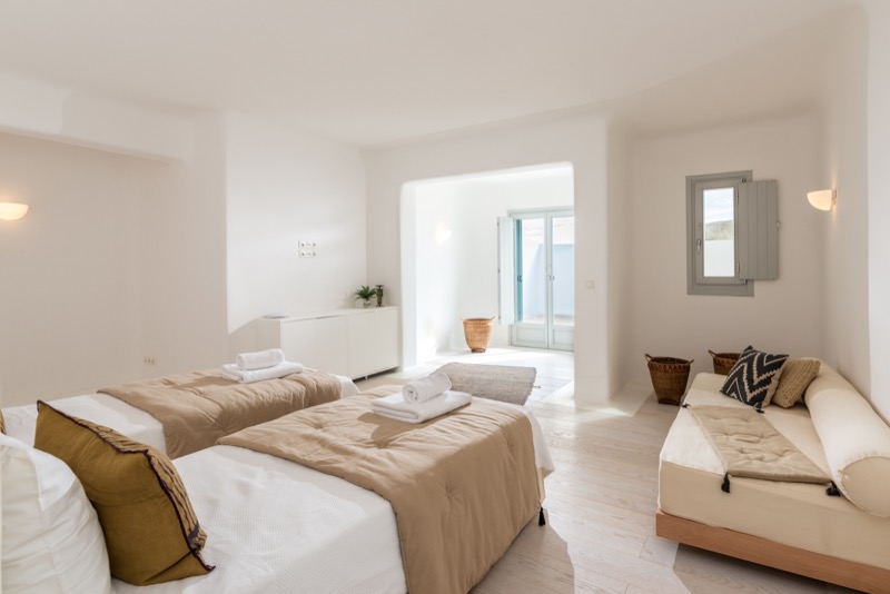 Inside, the layout is spacious and open, with whitewashed walls, natural materials, and soft tones that reflect the island’s character. The bedrooms are spread across different levels, offering privacy and comfort, each with its own unique view or outdoor access.